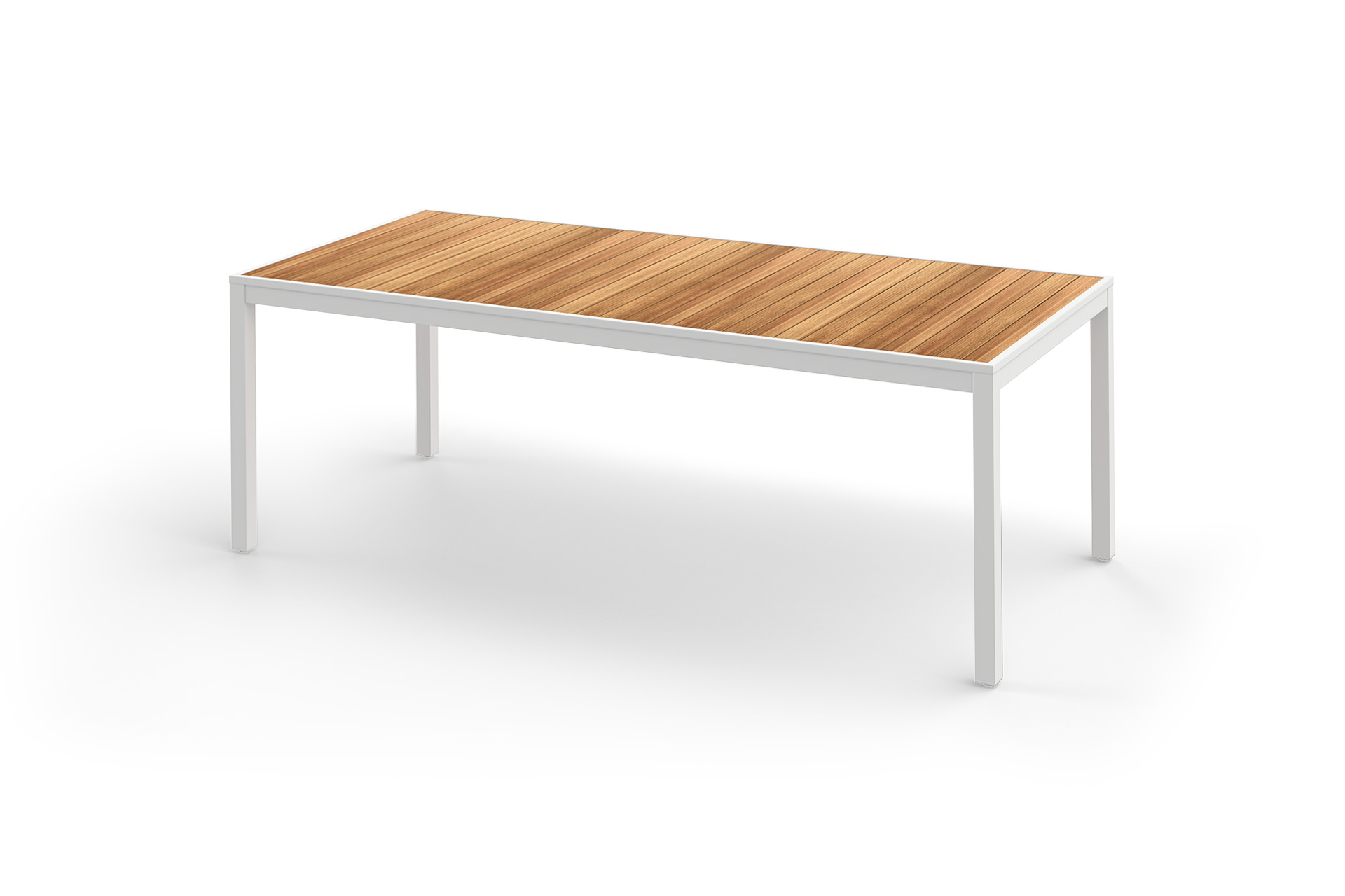 ALLUX dining tables are highly practical, easily customized outdoor seating solutions. This option uses standard, smooth teak slats for elegant, modern design dining. This is the medium size.